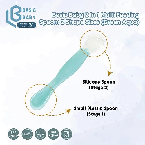 Basic Baby Feeding 2 in 1 Multi Feeding Spoon merupakan sendok dengan 2 ukuran dalam 1 sendok. 1 sisi sendok berukuran besar berbahan silicone yang aman dan lembut, 1 sisi lainnya sendok berukuran lebih kecil berbahan plastic dengan ukuran yang pas untuk mulut mungil si kecil.