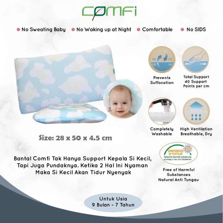 • Bantal Anti Keringat, Adem dan Sejuk: Karena bantal Comfi memiliki Ventilasi baik, artinya anak bisa tidur lebih nyenyak dan terhindar dari keringat berlebih