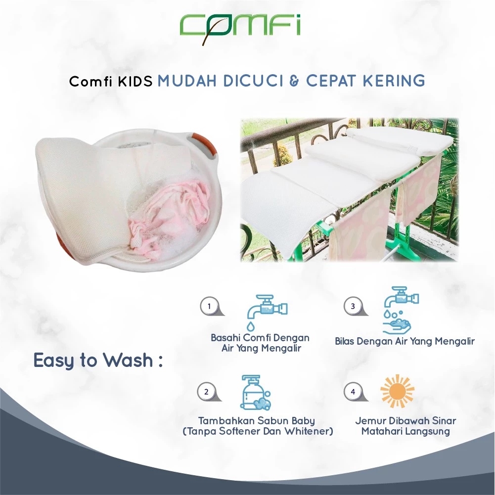 • Mencegah Kekurangan Nafas/ Suffocation: Comfi memungkinkan udara untuk lewat dengan bebas dan menyeluruh, sehingga mengurangi kemungkinan Anak kekurangan nafas atau suffocation