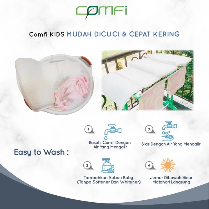 Sangat dianjurkan untuk mencuci dan mengeringkan Comfi di bawah sinar matahari langsung secara teratur untuk menghilangkan kotoran atau kuman