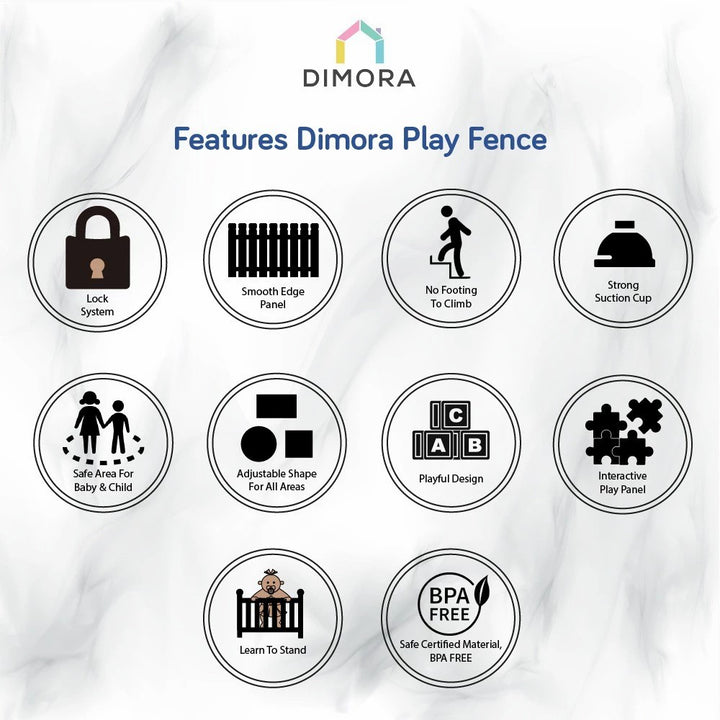 Dimora Play Fence dengan kualitas terbaik sebagai pusat beraktifitas yang menjamin kenyamanan & keamanan si kecil. Dapat menjadi pembatas area, atau guide untuk area bermain si kecil agar bisa explore and imagine.