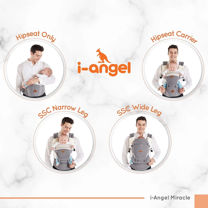 4. Dengan i-Angel MIRACLE: Dapat digunakan Hipseat + Hipseat Carrier + Soft Carrier untuk semua posisi. Bisa dijadikan gendongan hadap depan, hadap dalam atau di punggung untuk posisi Hipseat Carrier + Soft Carrier