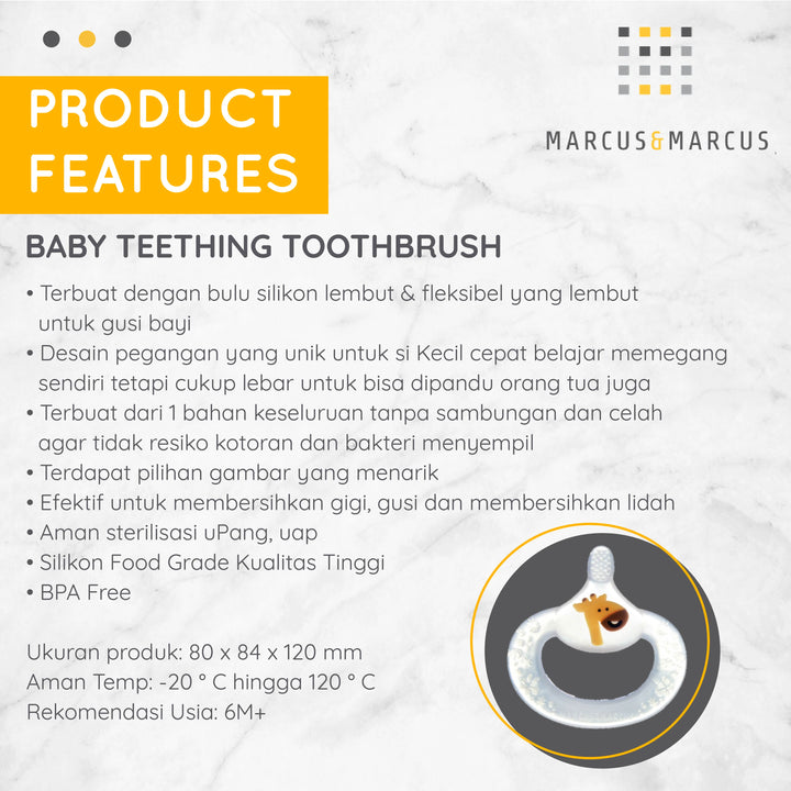 - Marcus&Marcus Baby Teething Toothbrush di desain secara sangat unik dan menarik khusus untuk si Kecil yang sedang mulai tumbuh gigi dan bertumbuh dalam perkembangan motorik