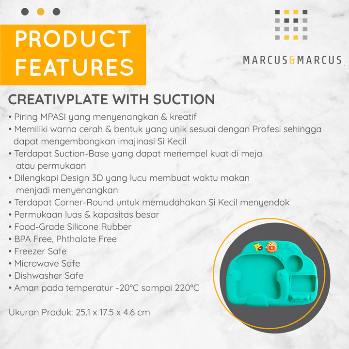 Marcus & Marcus Creativplate With Suction - Piring Karakter Anak Bayi Sekat Makan MPASI Suction Silikon Sekat Tiga Anti Tumpah | BPA FREE