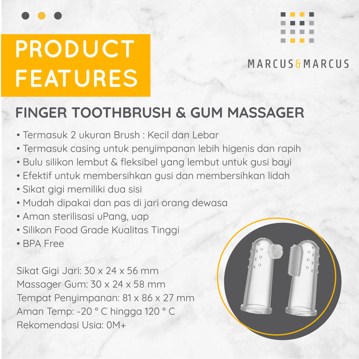 - Marcus dan Marcus Finger Toothbrush & Gum Massager Set adalah satu set sikat gigi bayi tahap pertama perawatan mulut.