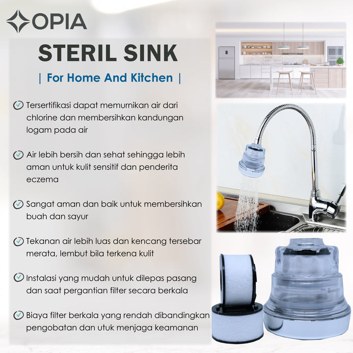 Opia Steril Sink adalah filter air dengan daya pemurnian tinggi yang memiliki Sertifikat dan Tes Lab Efektif menghilangkan partikel kotoran, bahan kimia berbahaya serta menghilangkan kandungan Chlorine pada air. Semua kontaminan ini ada dalam air biarpun air terlihat jernih dan tidak terlihat kasat mata.