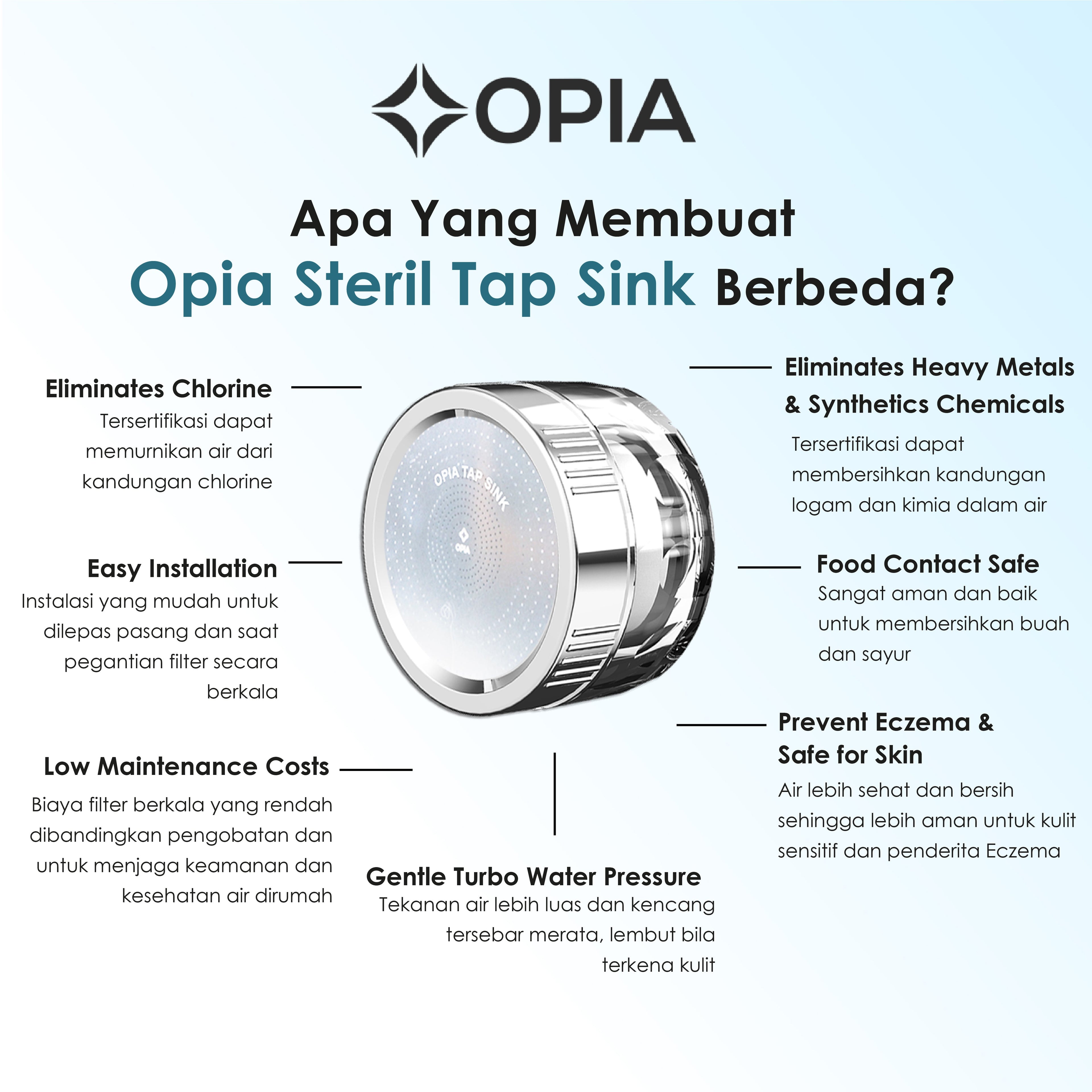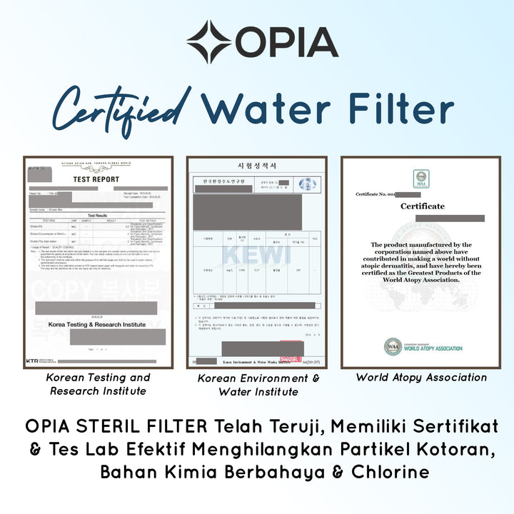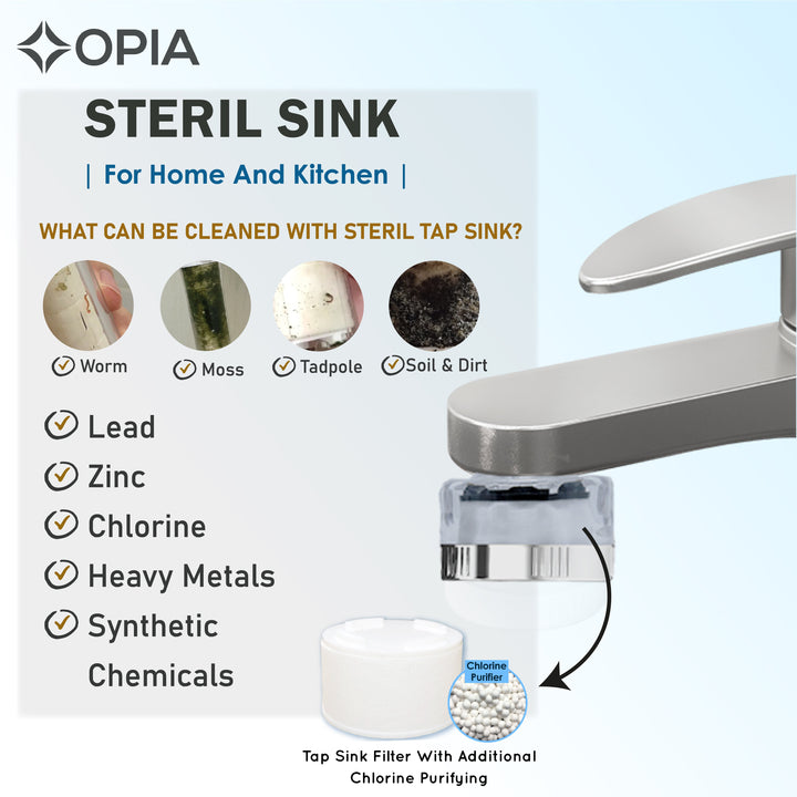 Opia Steril Tap Sink adalah filter air dengan daya pemurnian tinggi yang memiliki Sertifikat dan Tes Lab Efektif menghilangkan partikel kotoran, bahan kimia berbahaya serta menghilangkan kandungan Chlorine pada air. Semua kontaminan ini ada dalam air biarpun air terlihat jernih dan tidak terlihat kasat mata. Hal ini dapat berdampak negatif, terlebih pada bayi yang memiliki kulit yang sensitif.