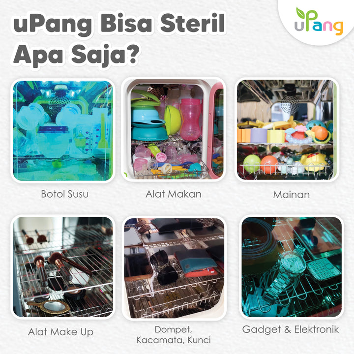 Dengan uPang, Anda sekarang dapat mensterilkan segala sesuatu make up brush, produk make up, sikat gigi, dompet, dan gadget - hampir apa pun yang Anda ingin bersihkan dan sterilkan. Semua dapat dilakukan dengan menekan sebuah tombol.